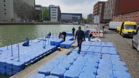 Für den Fritzlarer Pferdemarkt vom 13. bis 16. Juli haben im Auftrag der Stadt Fritzlar, die Ortsverbände Kassel und Fritzlar eine schwimmende Behelfsbrücke über die Eder gebaut. Rund 35 Helfer haben innerhalb von 12 Stunden die 4 m breite und 30 m lange Pontonbrücke selbst montiert. Die schwimmende Behelfsbrücke für Fußgänger bleibt bis zum 22.… 71. THW baut schwimmende Brücke aus Pontons über die Eder weiterlesen