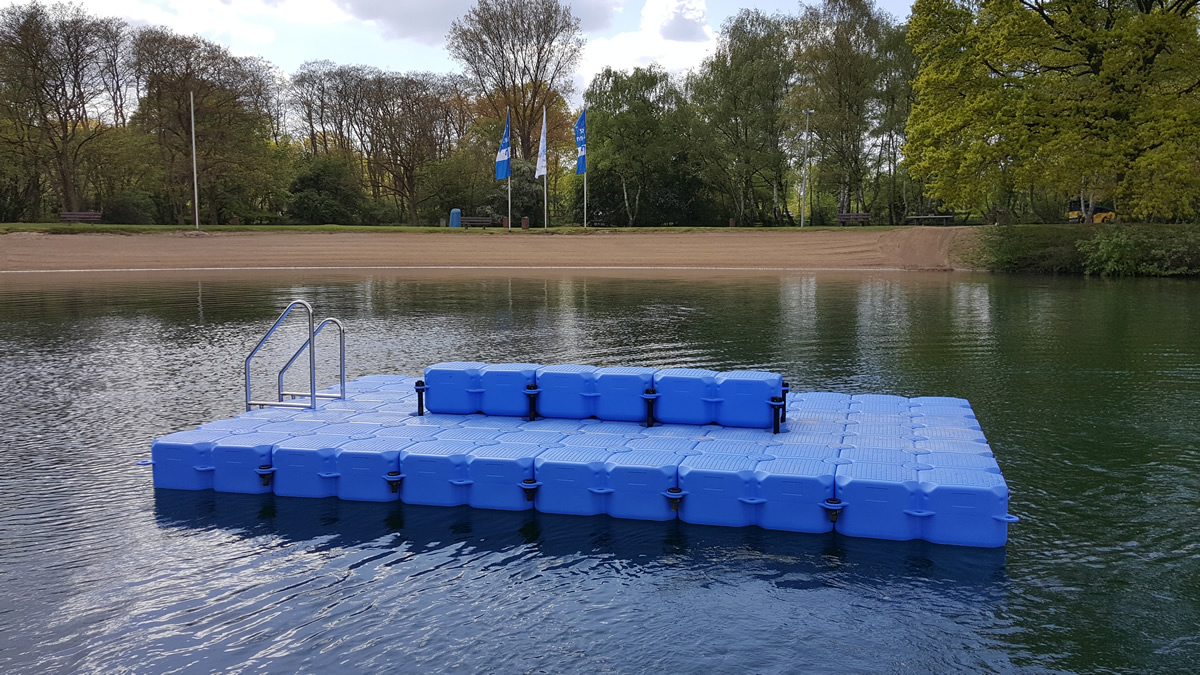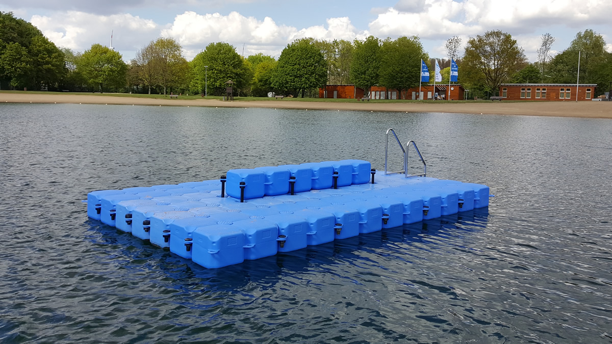 Zwei der drei Ponton Badeinseln befinden sich am Kaarster See und die dritte am Straberg-Nievenheimer See. Alle drei Badeinseln aus JETfloat Schwimmkörpern wurden jeweils mit einer zusätzlichen Sitzgruppe von 3m x 0,5m ausgestattet. Die Sitzgruppen sind je 0,4m hoch und ermöglichen Badegästen, sich bequem hinzusetzen und sich darauf auszuruhen.